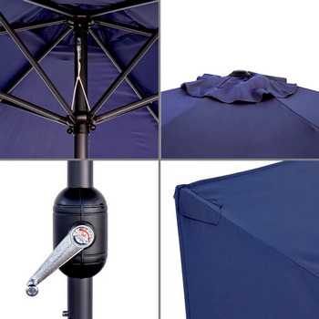 - Tela de Poliéster de Alta Calidad: La cubierta está hecha de poliéster de 180 gramos en un profundo tono azul marino, que no solo añade un toque de elegancia sino que también es resistente al desgaste y a la decoloración por los rayos UV. La ventilación superior integrada ayuda a reducir el impacto del viento y facilita un flujo de aire constante, mejorando la estabilidad del parasol.