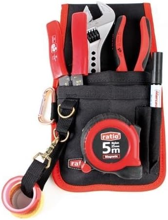 Cuenta con 4 compartimentos para herramientas, 1 correa portacintas aislante y 1 mosquetón metálico.