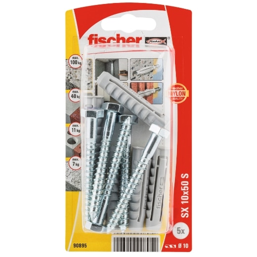 Debido a la expansión por sus 4 costados, la fijación por expansión SX de Fischer transfiere de manera óptima las fuerzas al material de construcción. El nylon de alta calidad usado en su producción y su expansión típica garantizan una conexión segura y permanente. El reborde en la cabeza de la fijación evita que el taco se cuele dentro del orificio del taladro. Los tornillos suministrados con el SX son de la medida ideal para garantizar una expansión óptima. Se puede fijar por ejemplo: lámparas, instalaciones de baños, armarios ligeros.